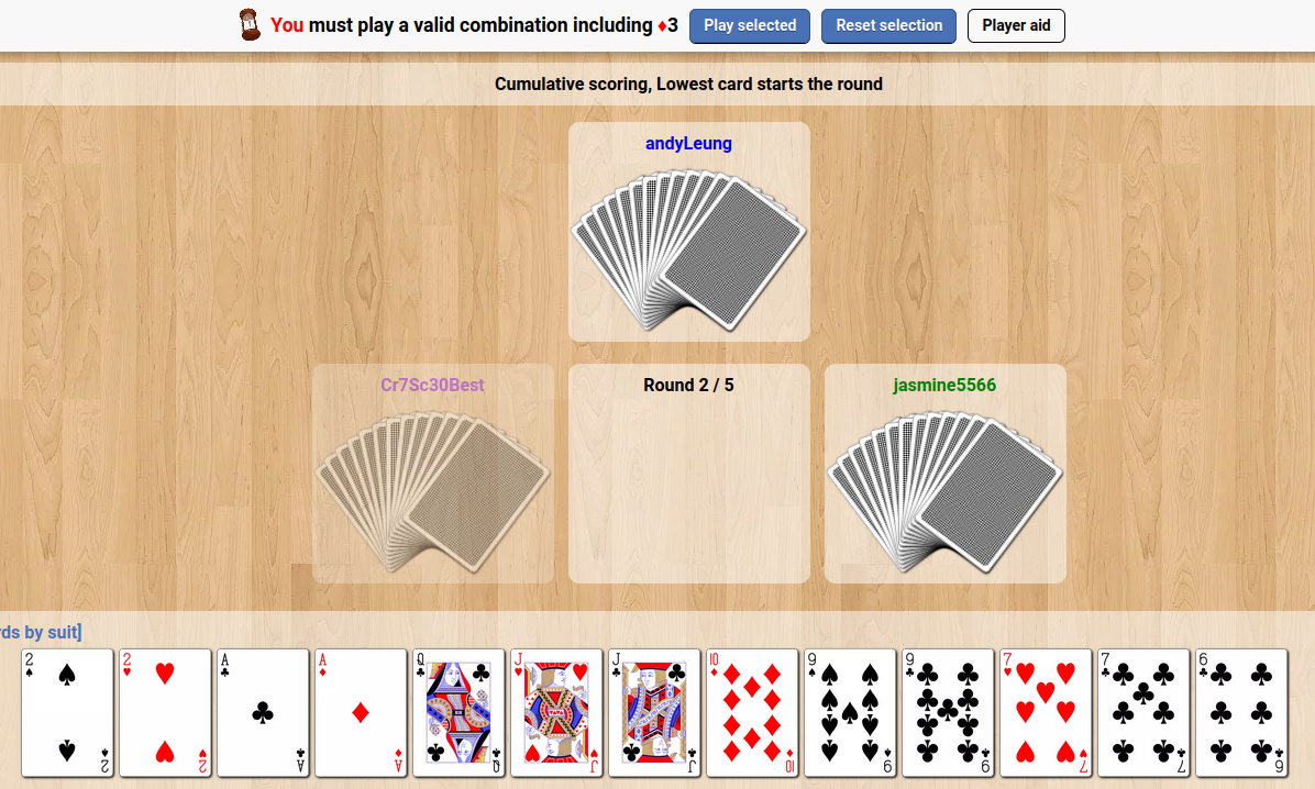 I don't hold the ♦3; I tried to play just the lowest card in my hand (the ♣6) but got the error "You must play a combination including the lowest card". I propose that if anyone leaves the game with "Lowest card starts the round" active, only the hands of players still in the game are considered for the lowest card.