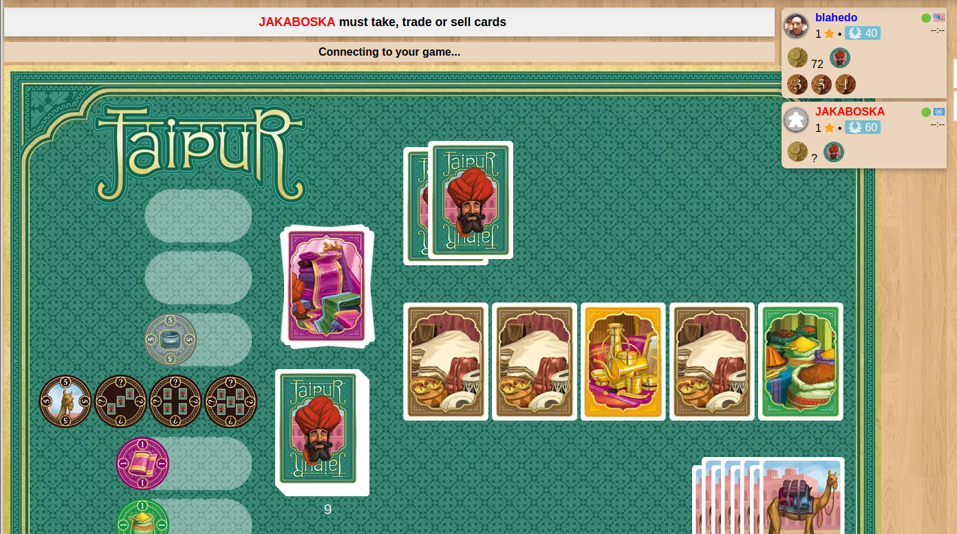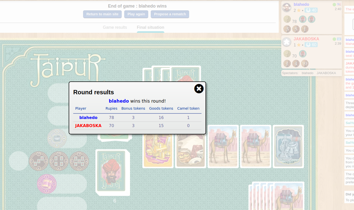 Similarly, the shot blahedo.org/bga/jaipur-2.png shows the end of that game a few moments later. The first reading of a table like that was that 78 is the sales, *plus* some stuff shown in the other columns, though that's clearly wrong, but it did still take a lot of processing and checking through the replay to see that the number on left is the entire score. It's clearer in retrospect (i.e. now that I know what it all represents I can read the information) but the suggestion here would be that the headers would read "Rupees Bonuses Goods Camel", and the blahedo row would be "78 9 64 5" or "78 | 9 (3 tokens) 64 (16 tokens) 5 (1 token)" or something like that.